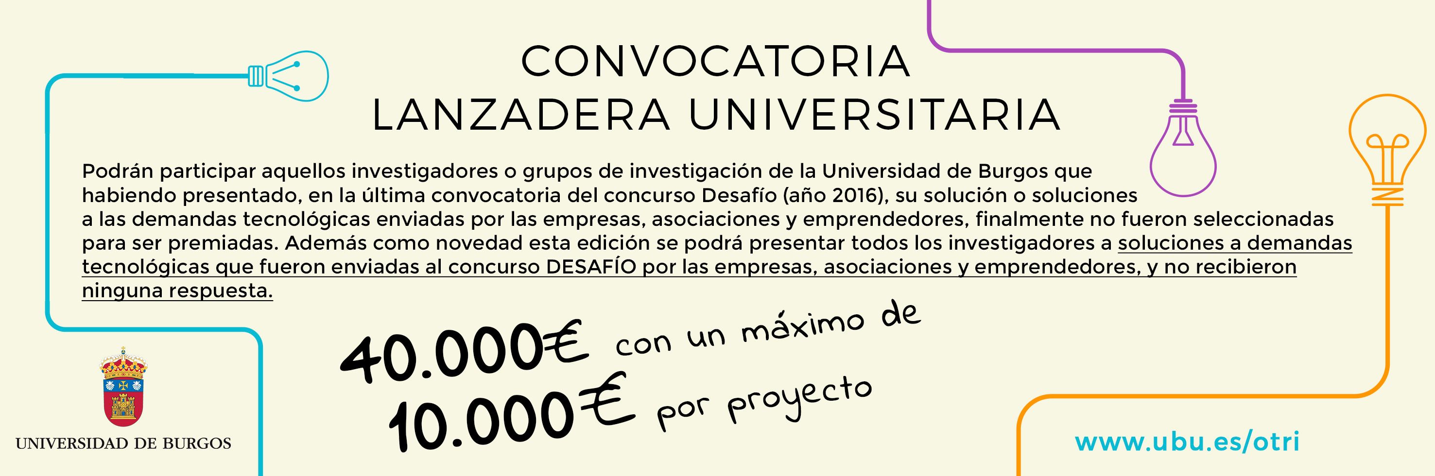 La convocatoria “Lanzadera Universitaria” pretende apoyar aquellos proyectos presentados en la anterior edición del concurso Desafío Universidad-Empresa (2016). De esta manera se ofrece una segunda oportunidad de realizar proyectos de I+D+i y/o consultoría conjuntos en los que colaboren importantes organismos generadores de conocimiento en Castilla y León y el tejido empresarial de su entorno, dentro de las prioridades temáticas identificadas en la Estrategia Regional de Investigación e Innovación para una Especialización Inteligente (RIS3) de Castilla y León 2014-2020.