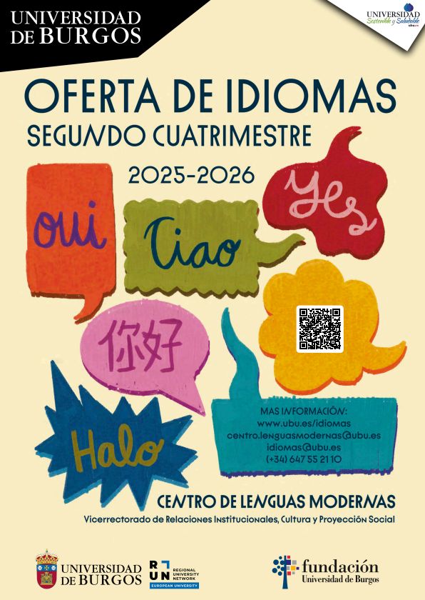 El Centro de Lenguas Modernas (CLM) de la Universidad de Burgos (UBU), dependiente del Vicerrectorado de Relaciones Institucionales, Cultura y Proyección Social y gestionado por la Fundación General de la misma, presenta la Oferta de Cursos de Idiomas para el Segundo Cuatrimestre del Curso Académico 2025-2026.