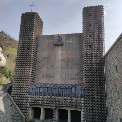 El Santuario de Arantzazu es una basílica reconstruida en el año 1951 donde en la fachada aparecen 14 apóstoles realizados por el escultor Jorge Oteiza, las puertas de hierro son de Eduardo Chillida y las pinturas de Nestor Basterretxea y Lucio Muñoz.