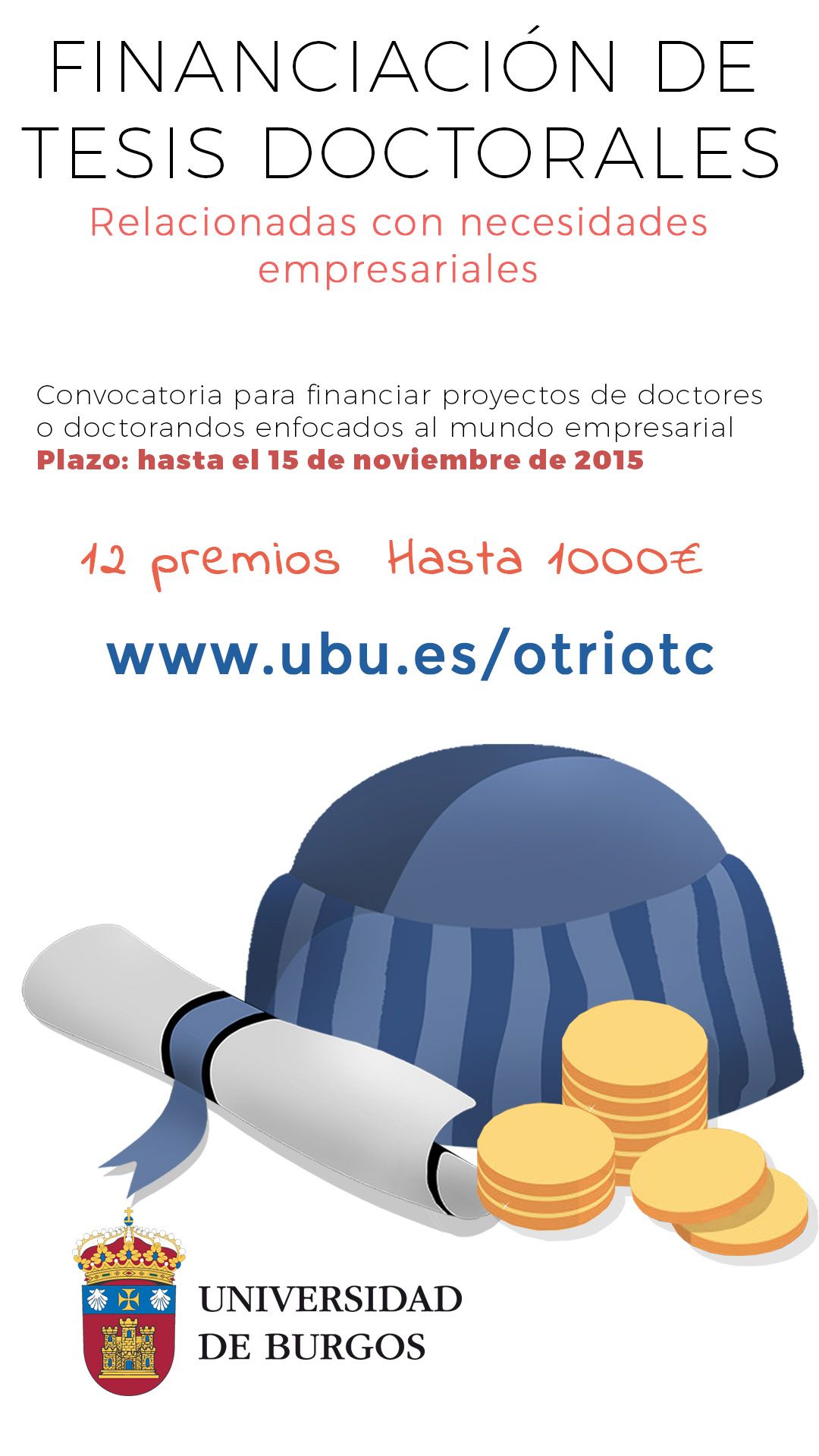 Para ello se convocan un máximo de 12 premios para doctores, que hayan defendido su tesis doctoral en la Universidad de Burgos a lo largo de los años 2014 y 2015, o doctorandos cercanos a la finalización de su tesis doctoral, siempre que ésta verse sobre aspectos relacionados con necesidades empresariales, y puedan contar con una clara aplicabilidad industrial.