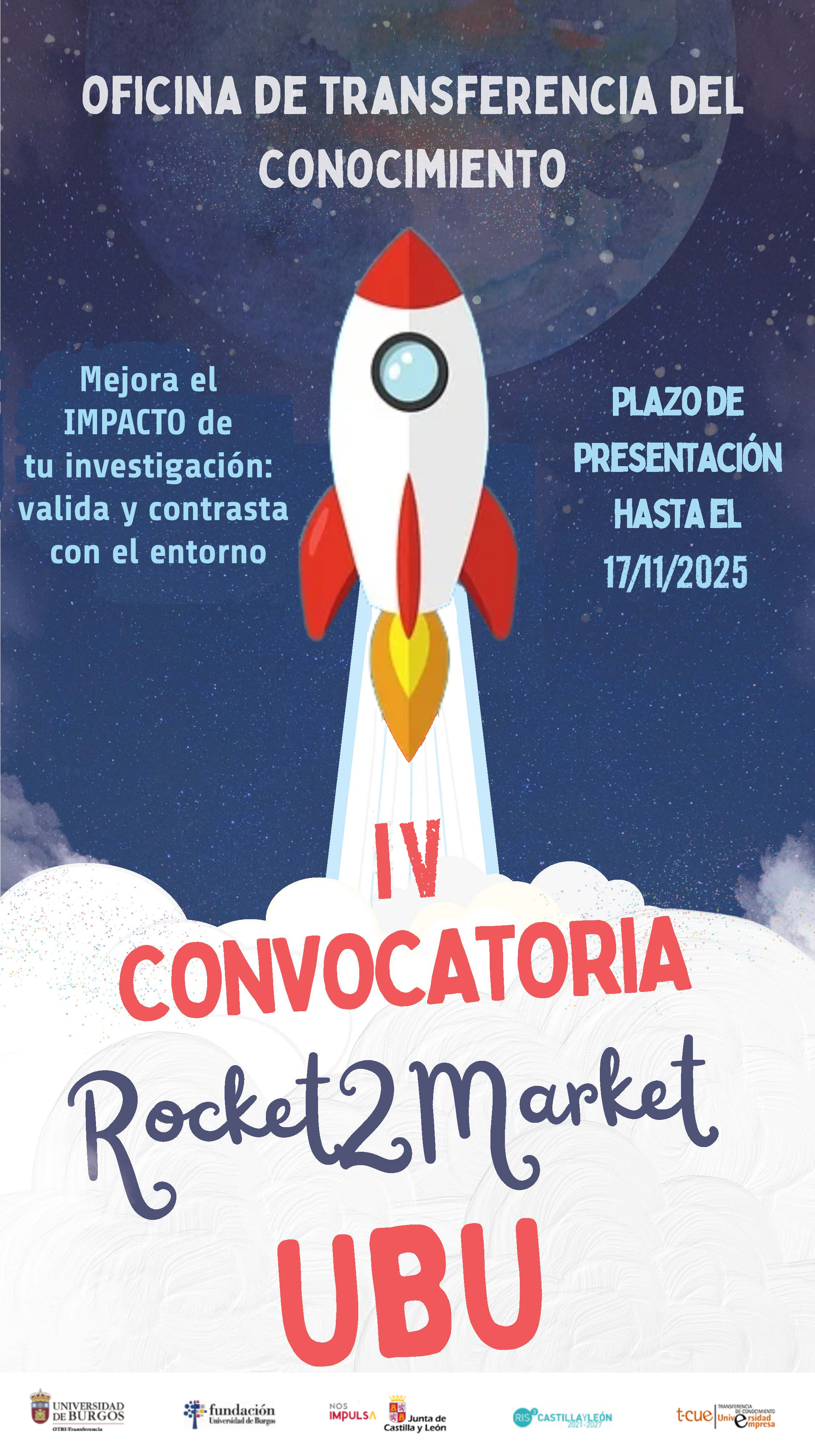 Las propuestas se presentarán a través de correo electrónico a otri@ubu.es, asunto “IV Convocatoria Rocket2Market”. Se enviarán todos los documentos requeridos en formato pdf, incluida firma electrónica del coordinador.
