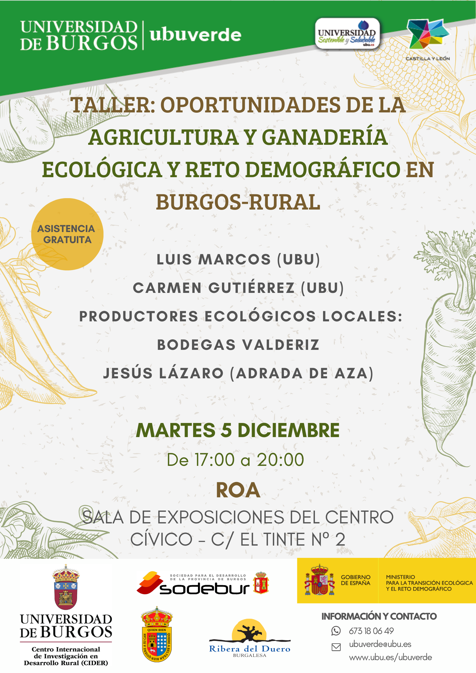 La Oficina Verde de la Universidad de Burgos, en colaboración con la Junta de Castilla y León y con Sodebur y Miteco organiza el Taller Técnico-Ambiental: “Oportunidades de la Agricultura Ecológica y Reto Demográfico en Burgos-Rural: La Ribera del Duero”. En Roa, el martes 05 de diciembre de 2023 a las 17:00h.