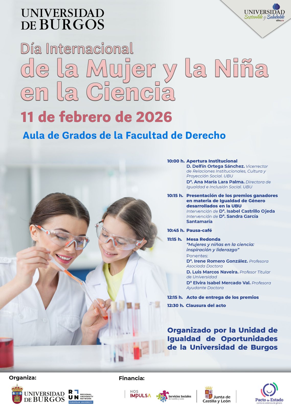 La Unidad de Igualdad de Oportunidades de la Universidad de Burgos celebra el miércoles 11 de febrero a partir de las 10:00 h la jornada Internacional de la Mujer y la Niña en la Ciencia, cuya apertura correrá a cargo del vicerrector de Relaciones Institucionales, Cultura y Proyección Social de la UBU, Delfín Ortega Sánchez, y la directora de la Unidad de Igualdad de Oportunidades, Ana María Lara Palma.