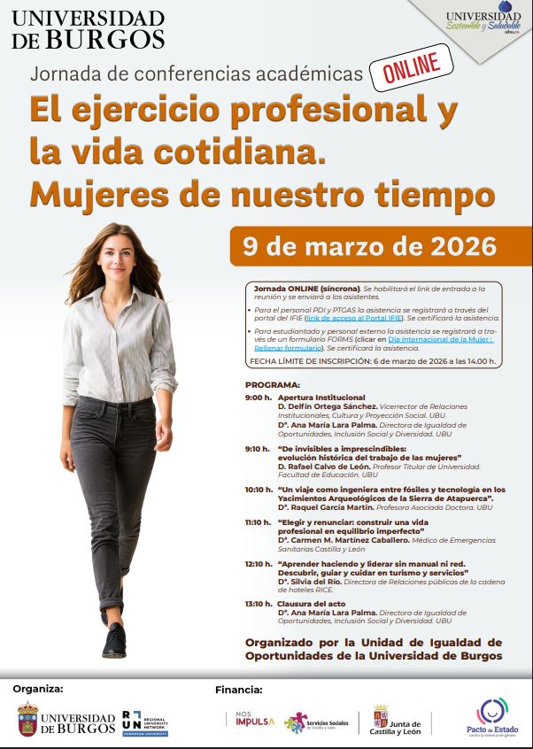 La Unidad de Igualdad de la Universidad de Burgos organiza el 9 de marzo de 2026 la Jornada de Conferencias Académicas "El ejercicio profesional y la vida cotidiana. Mujeres de nuestro tiempo", en modalidad online, síncrona. Se habilitará el link de entrada a la reunión y se enviará a los asistentes.