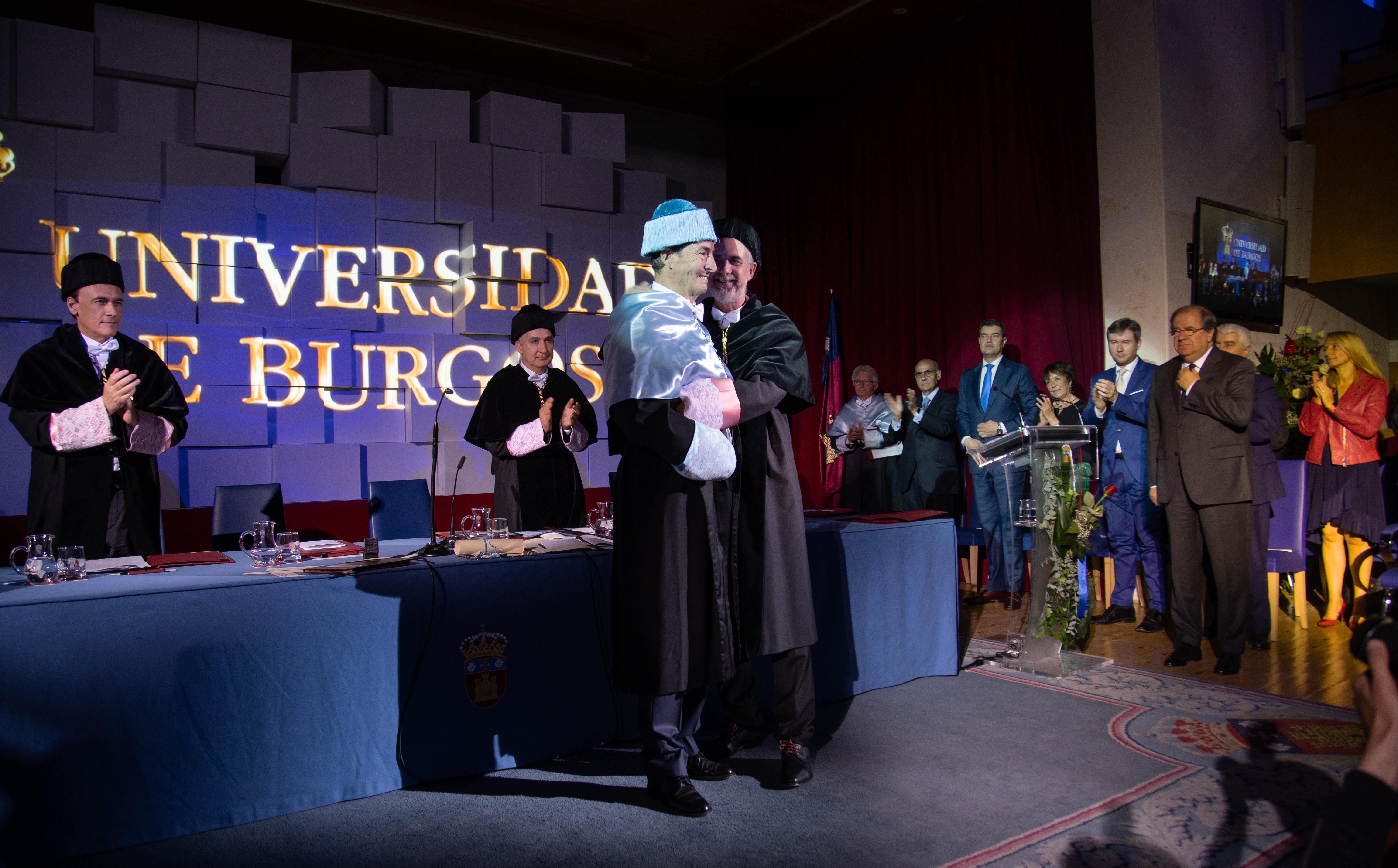 El padrino entrega los atributos al nuevo doctor honoris causa por la Universidad de Burgos
