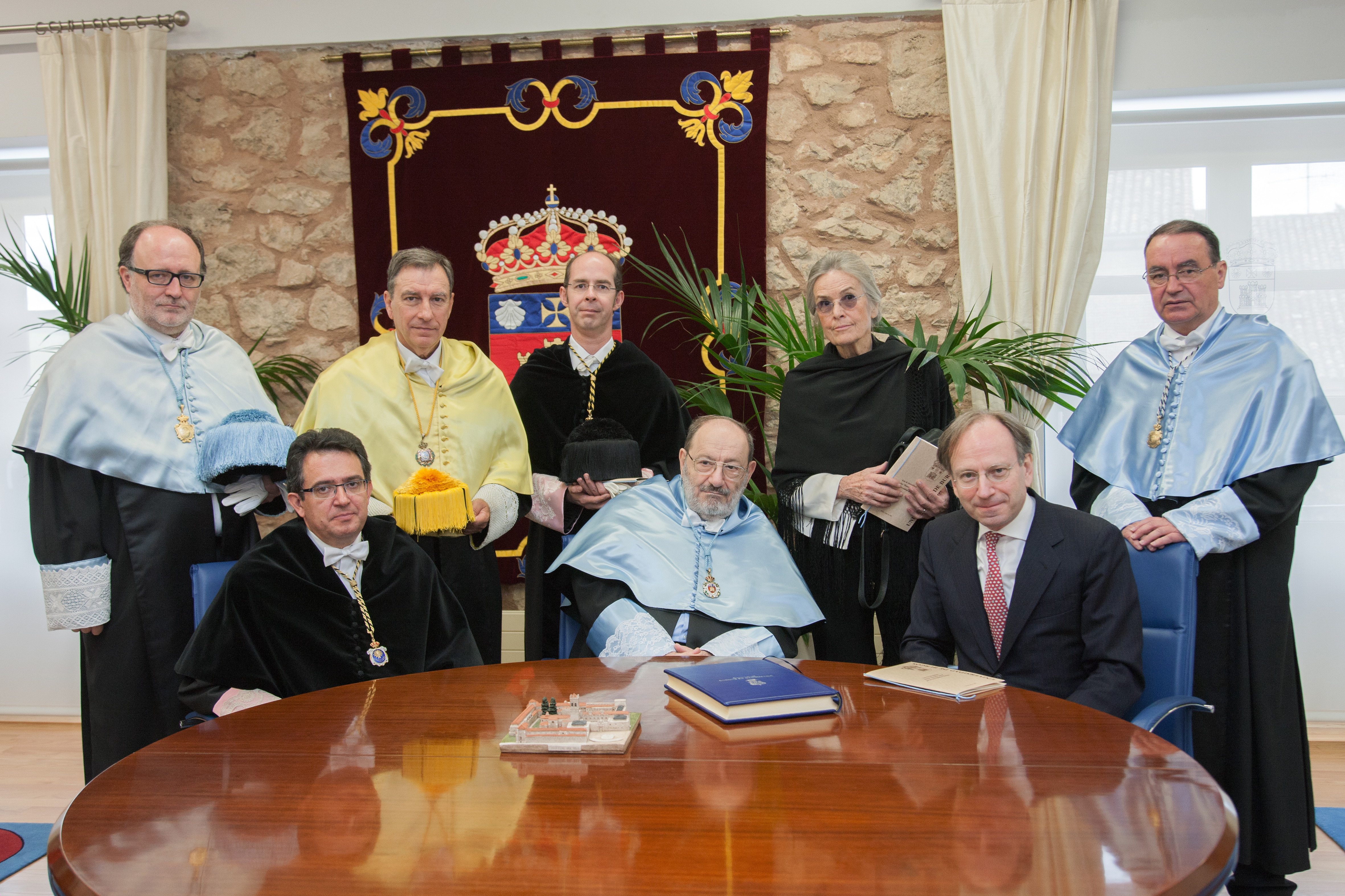 Rector, Umberto Eco, Embajador de Italia. Detrás: Vicerrector USAL, Consejero, Rector M.Cervantes, Sra. de Umberto Eco y Padrino