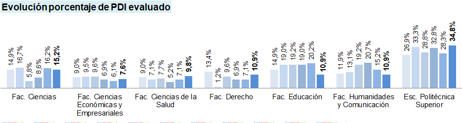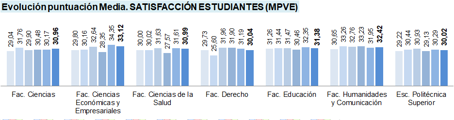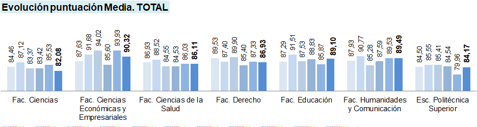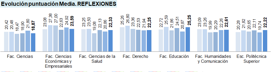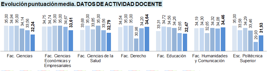 Se presentan valores para la 12ª (azul más claro) a 17ª (azul más oscuro) convocatoria, dado que los elementos evaluables, fuentes de información, y puntuaciones máximas y mínimas son homogéneas, así como sucede con los Centros existentes en la UBU en estas convocatorias.