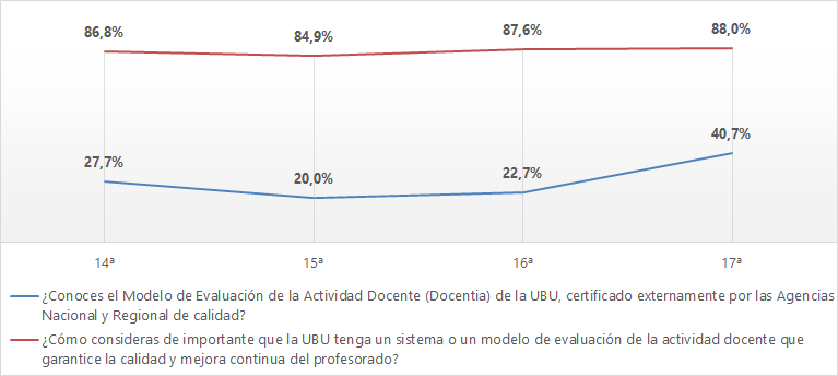 % de estudiantes que conocen el modelo Docentia de la UBU y % de estudiantes que consideran relevante que la UBU tenga el modelo Docentia implantado.