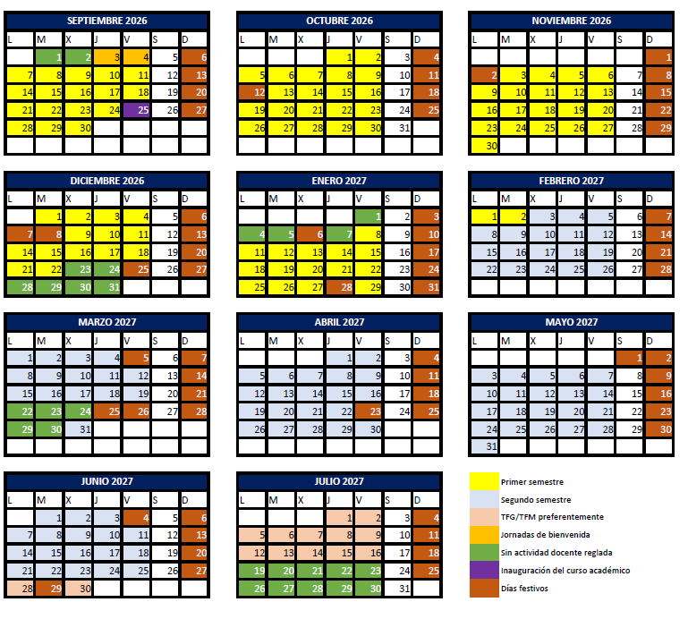 - 1-2/09/26; 19-30/07/27: Días lectivos sin actividad docente reglada